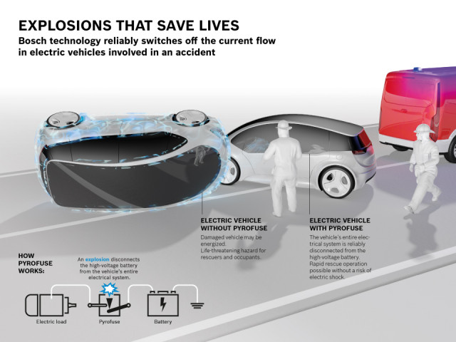 Bosch uses pyrotechnics to boost battery safetyUsing a system similar to airbag detonation, Bosch aims to stay safe by cutting the connection to batteries in the event of an accident.